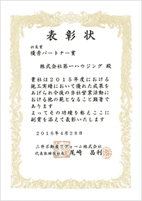 2016年4月28日(木)、京王プラザホテル南館におきまして、三井不動産リフォーム株式会社(現三井デザインテック株式会社様)より、「社長賞、優秀パートナー賞」という賞を頂きました。